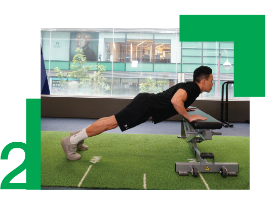 描述:保持身體固定於中立位置,挺胸收腹,下巴微收,吸氣時將胸部下壓至凳前,呼氣時用手將身體推離。