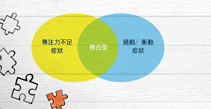 ADHD症可分為兩大類:專注力不足症狀以及過動/衝動症狀。從而可分為三大類型:複合型(即同時兩類症狀都符合診斷標準)、專注力不足型及過動/衝動型(即只有其中一類的症狀符合診斷標準)。一般來說,ADHD症狀都會在12歲之前出現,影響患者成長階段的身心發展。